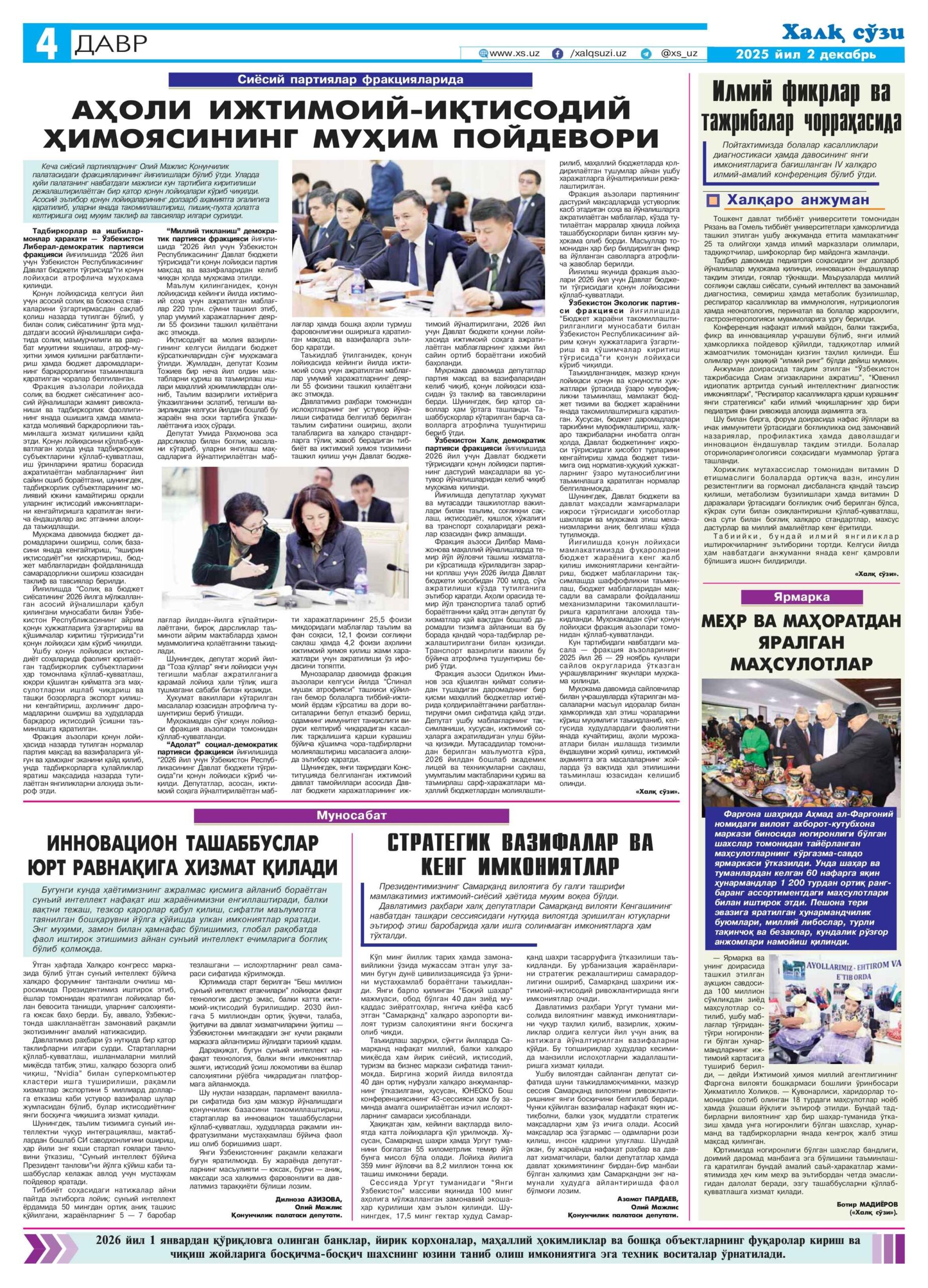 Xalq so’zi gazetasining 2025-yil 2-dekabrda chiqqan 251-sonida joriy yilning 28-29-noyabr kunlari o’tkazilgan “Zamonaviy pediatriyaning dolzarb muammolari: bolalar kasalliklari diagnostikasi va davosining yangi imkoniyatlari” mavzusidagi IV Xalqaro ilmiy-amaliy anjuman haqida xabar berildi.